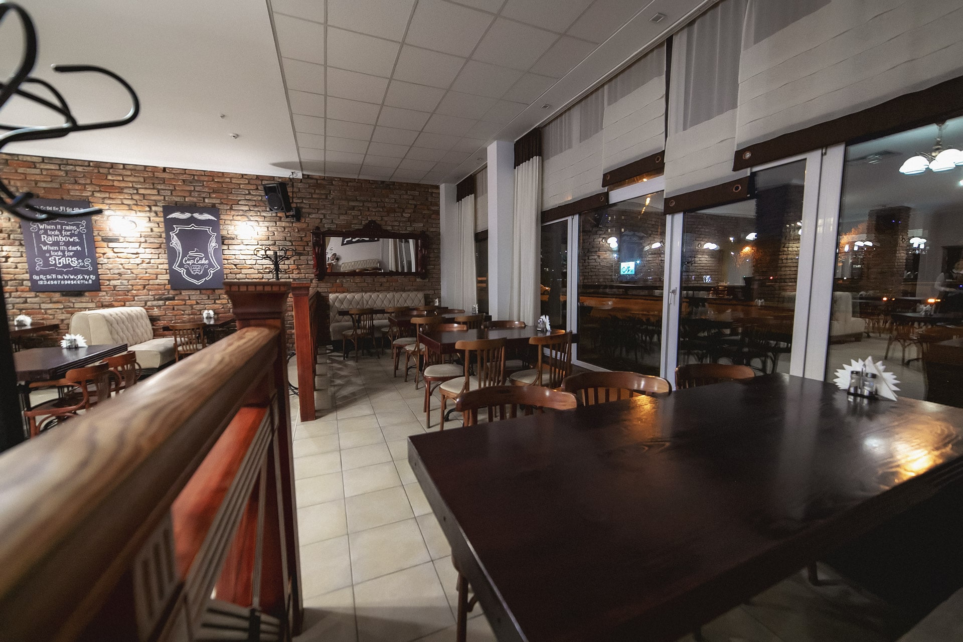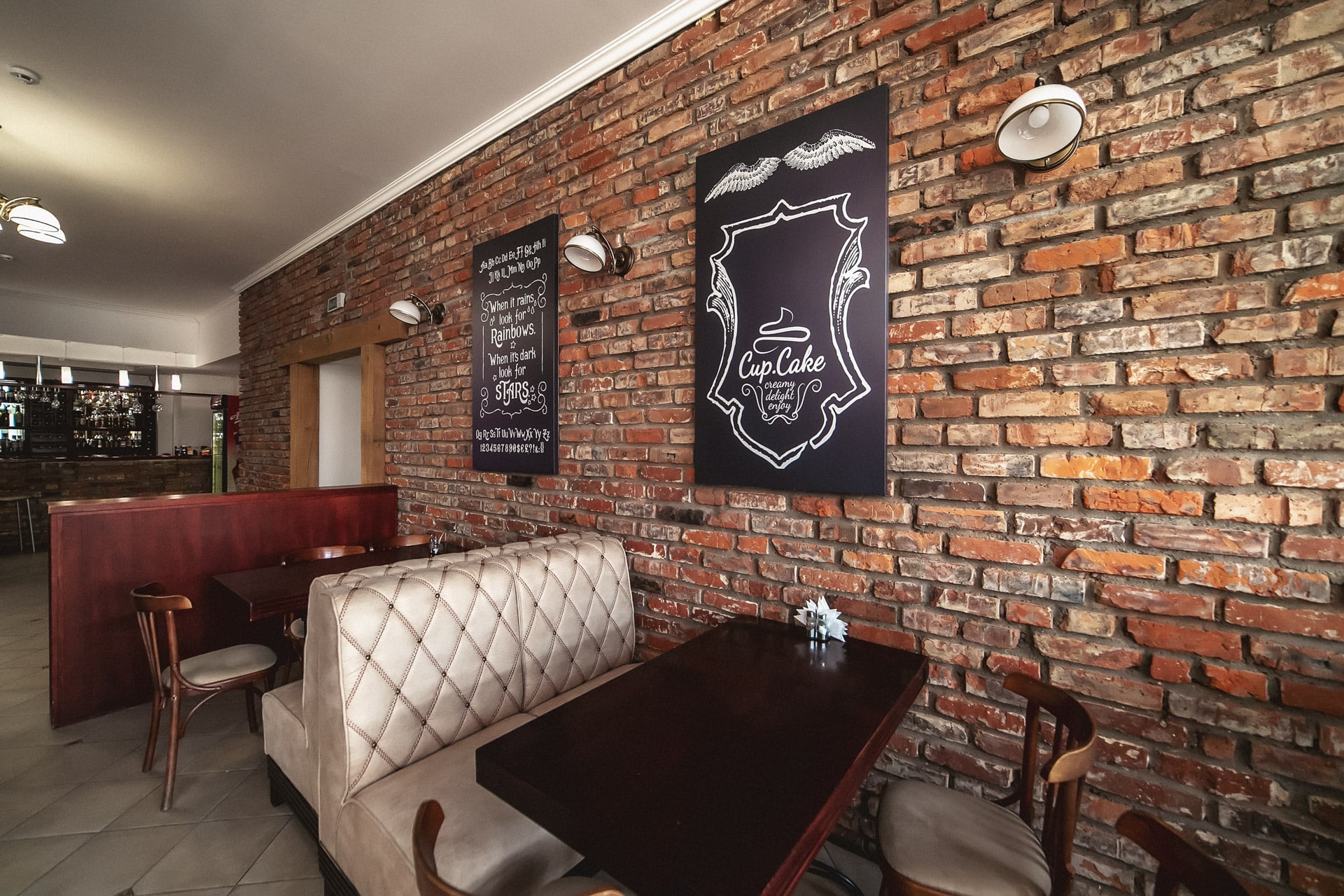 Интерьер кафе «Могилев» органично сочетает в себе красный кирпич и натуральное дерево, из которого под заказ изготовлены балясины, обрамление для зеркала и столешницы, расположенные на кованых подстольях. Стены заведения украшены современными картинами.